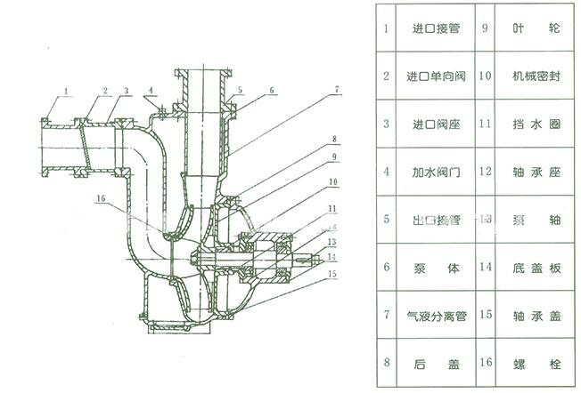 ZW型無(wú)堵塞自吸式排污泵主要由泵體、葉輪、后蓋、機(jī)械密封、泵軸、軸承座、進(jìn)口閥、氣液分離管、加水閥門、進(jìn)、排接管等組成。泵的結(jié)構(gòu)見(jiàn)圖。