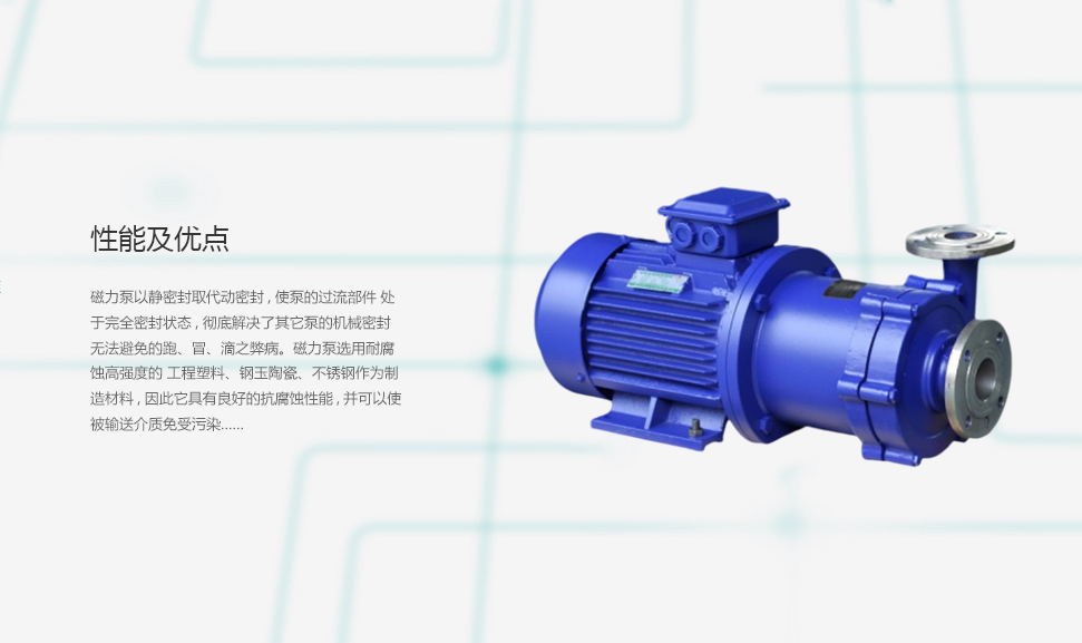 磁力泵結(jié)構(gòu)緊湊,外形美觀,體積小,噪音低,運(yùn)行可靠,使用維修方便。可廣泛用于化工、制藥、石油、電鍍、食 品、國(guó)防、科研機(jī)構(gòu)、冶金、染料等單位抽送酸、堿液、油類稀有貴重液、毒液、揮發(fā)性液體,以及循環(huán)水設(shè)備 配套、過(guò)濾機(jī)配套。特別是易漏、易,燃、易爆液體的抽送。防爆電動(dòng)機(jī)選用此泵則更為理想設(shè)備。