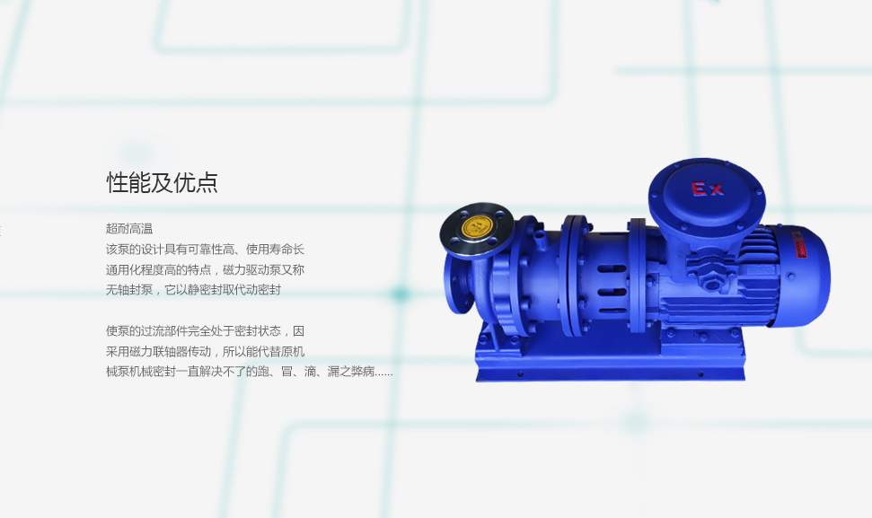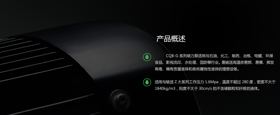 CQB-G 系列磁力泵適用與石油、化工、制藥、冶煉、電鍍、環(huán)保、食品、影視洗印、水處理、國(guó)防等行業(yè)。 是輸送高溫類易燃、易爆、揮發(fā)、有毒、稀有貴重液體和各類腐蝕性液體的理想設(shè)備。適用與輸送Z大系列工作壓力1.6Mpa,溫度不超過(guò)280度,密度不大于1840kg/m3,粘度不大于30cm/s的不含硬顆粒和纖維的液體。