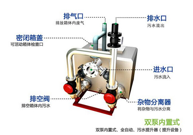 4、分體式雜物分離裝置:分體式雜物分離實現(xiàn)了雜物和污水的分離,雜物通過進水管路進入雜物分離裝置,并暫存在雜物分離器中,污水正常流入密閉式箱體,雜物不接觸排污 泵葉輪,排污泵工作排水時,通過排水管路,利用排污泵的排水水壓,帶走雜物分離器中暫存的雜物,提升排放到市政管網(wǎng)。徹底杜絕了用絞刀泵解決堵塞,但會纏繞泵、卡 泵的停機情況發(fā)生;