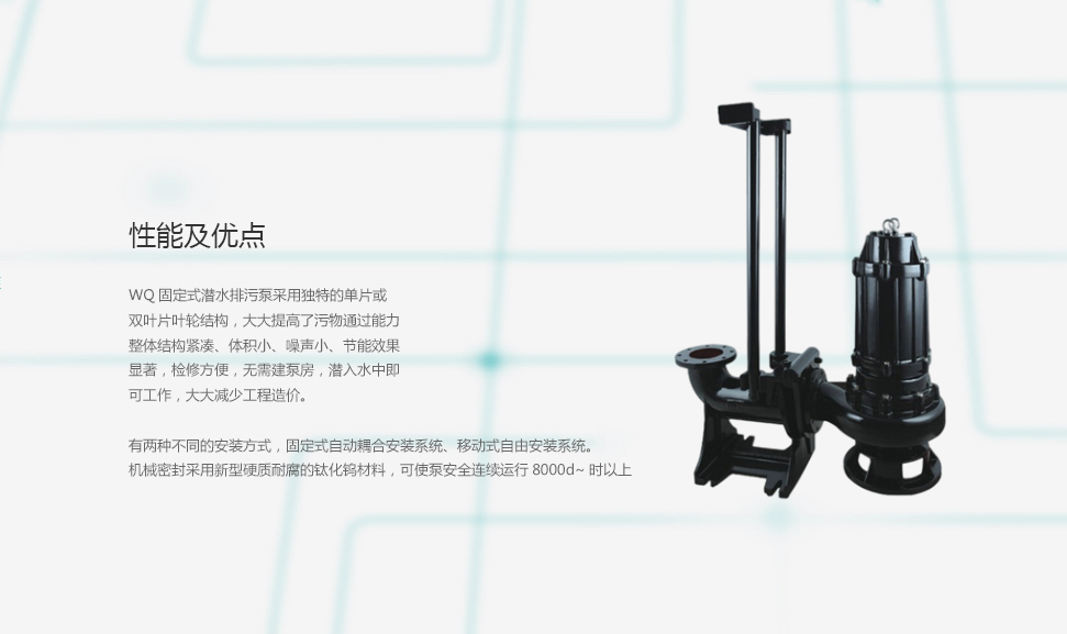 3.WQ固定式潛水排污泵整體結(jié)構(gòu)緊湊、體積小、噪聲小、節(jié)能效果顯著,檢修方便,無(wú)需建泵房,潛入水中即可工作,大大減少工程造價(jià)。